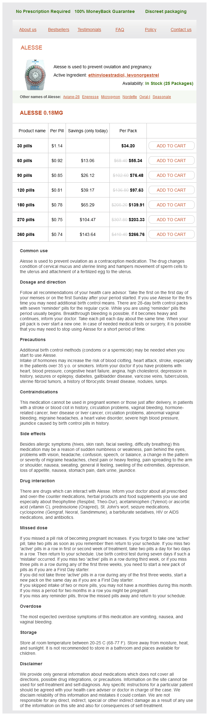 Alesse packs: 30 pills, 60 pills, 90 pills, 120 pills, 180 pills, 270 pills, 360 pills