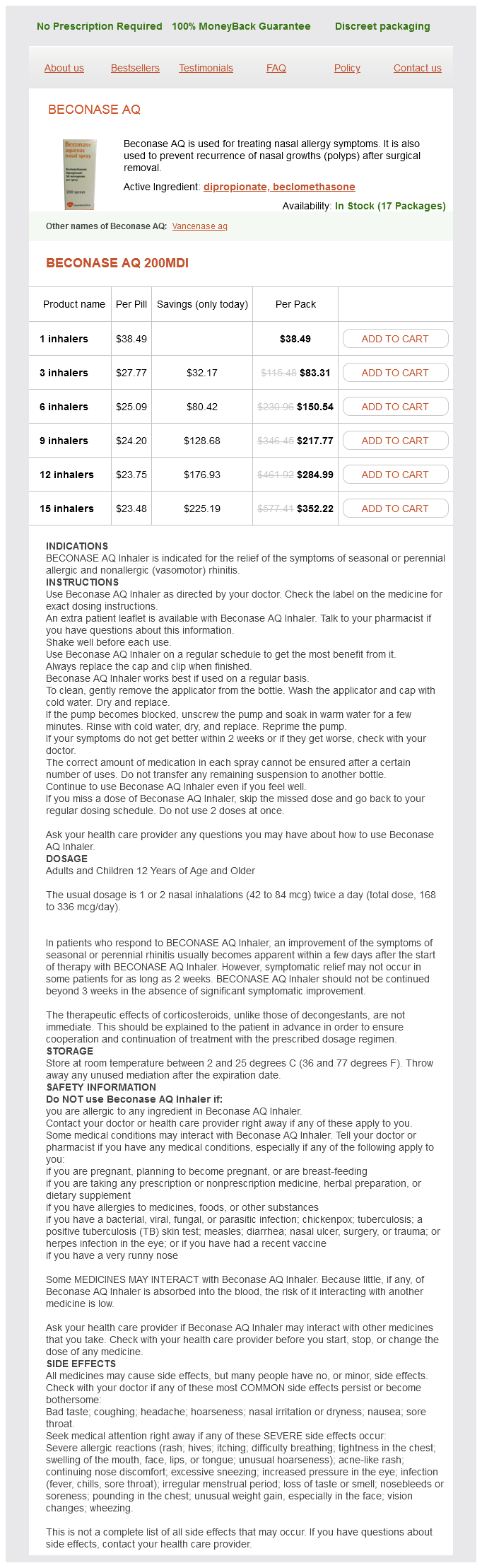 Beconase AQ packs: 1 inhalers, 3 inhalers, 6 inhalers, 9 inhalers, 12 inhalers, 15 inhalers