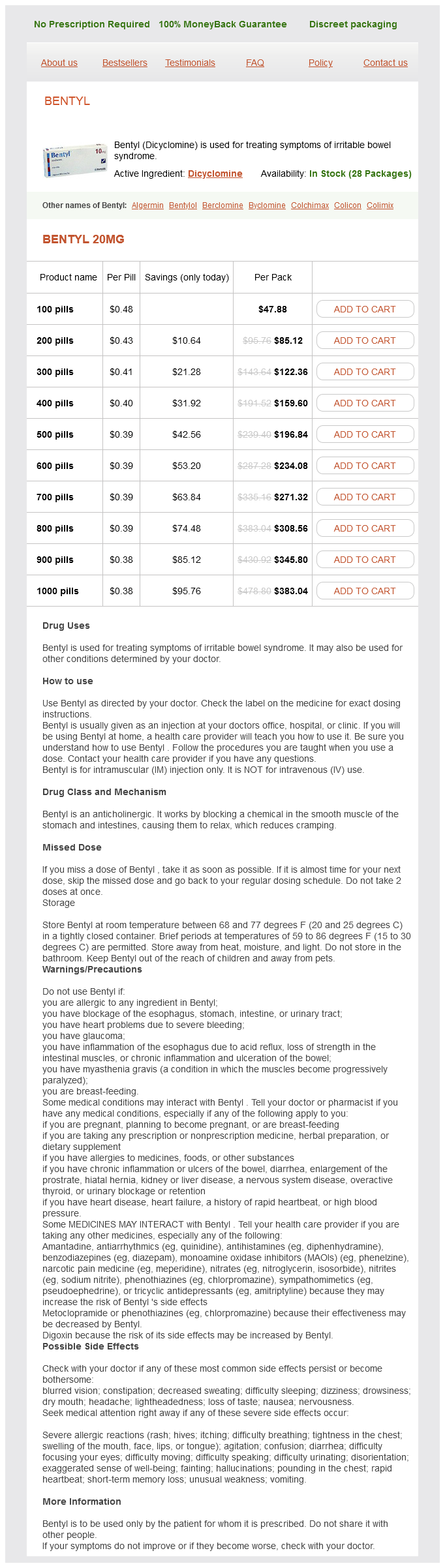 Bentyl packs: 100 pills, 200 pills, 300 pills, 400 pills, 500 pills, 600 pills, 700 pills, 800 pills, 900 pills, 1000 pills