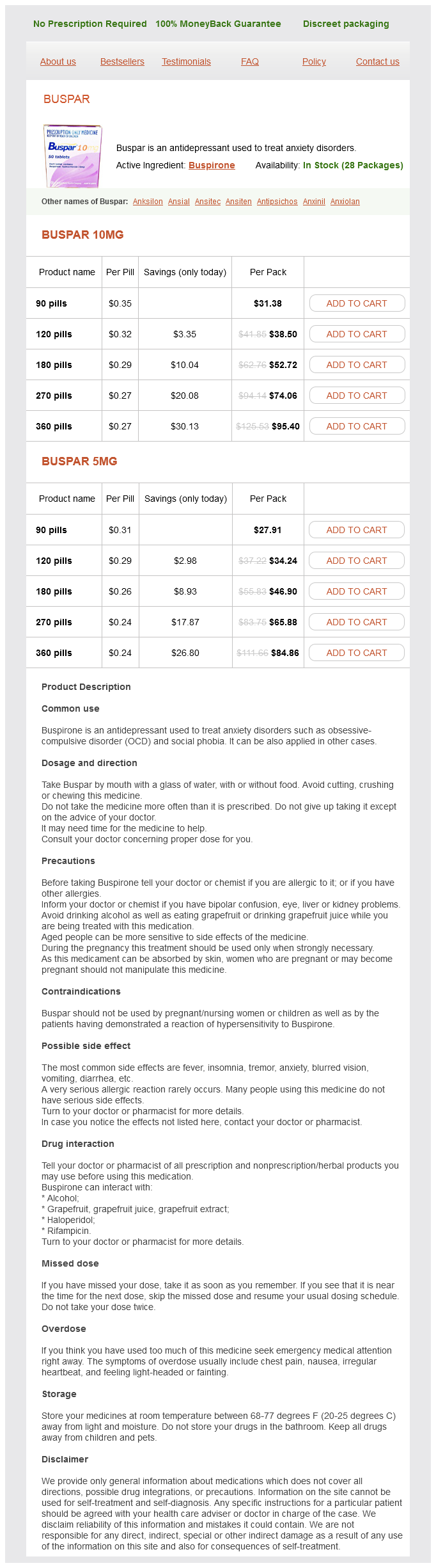 Buspar packs: 90 pills, 120 pills, 180 pills, 270 pills, 360 pills