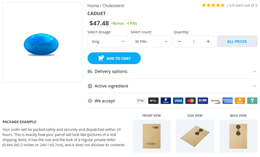 Caduet packs: 30 pills, 60 pills, 90 pills