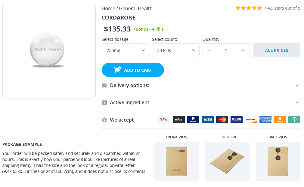 Cordarone packs: 30 pills, 60 pills, 90 pills, 120 pills, 180 pills, 270 pills, 360 pills
