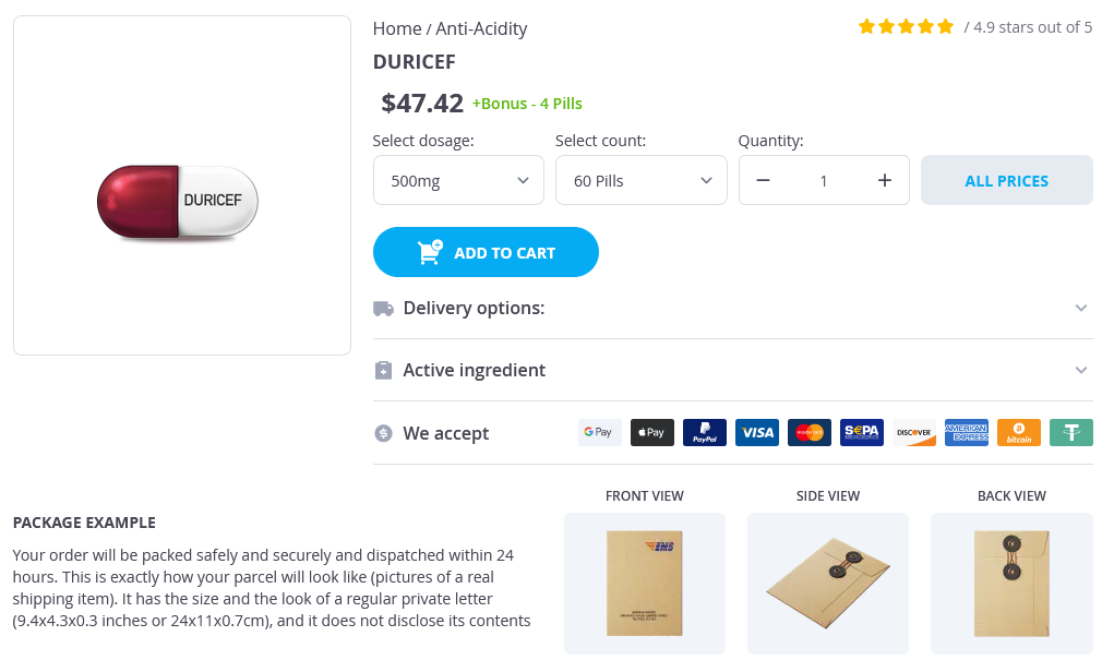 Duricef packs: 30 pills, 60 pills, 90 pills, 120 pills, 180 pills, 270 pills, 360 pills