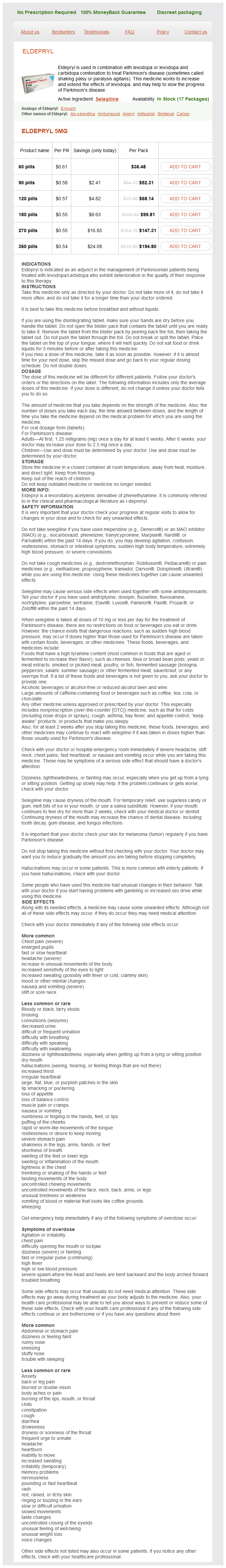 Eldepryl packs: 60 pills, 90 pills, 120 pills, 180 pills, 270 pills, 360 pills