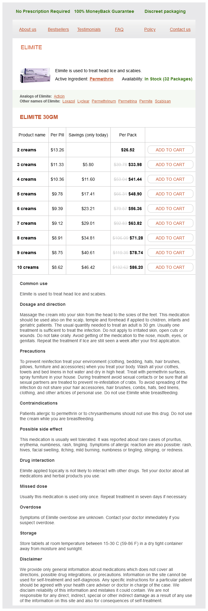 The therapeutic effect of this drug is reduced by glucocorticoids acne guidelines generic elimite 30 gm buy on-line, epinephrine, hydrochlorothiazide, and levothyroxine. This drug reduces the growth of facial hair in idiopathic hirsutism or hirsutism that is secondary to androgen excess 459. Betamethasone Fludrocortisone Metyrapone Spironolactone Triamcinolone Endocrine Systems 241 462. A 22-year-old male with a five-year history of bronchial asthma has developed increased frequency and severity of acute asthmatic attacks. A 76-year-old male complains of progressive difficulty starting his stream on urinating and having to get up at least once each night to urinate. Finasteride therapy is begun and results in improved urine flow and decreased prostate size. Spironolactone Furosemide Clomiphene Propranolol Medroxyprogesterone Chlorpropamide Plicamycin Phentolamine 465. While awaiting laboratory confirmation of the diagnosis, she is given a drug that diminishes her tachycardia and tremors. A 48-year-old male with a three-year history of carcinoma of the colon complains of intense pain in his hips. A 50-year-old female had a radical mastectomy three years ago for hormone-dependent breast adenocarcinoma. She is now complaining of shortness of breath, and chest X-ray shows diffuse lung metastases. A patient with no history of prior disease and taking sildenafil might develop which of the following adverse effects Acute pulmonary edema Severe headaches Amylasemia Priapism Profuse sweating Endocrine System Answers 412. The drug affects both normal and abnormal bone resorption and appears to reduce the activity of osteoclasts and osteoblasts. It inhibits the formation, growth, and dissolution of hydroxyapatite crystals, which is probably its main mechanism of action. There occurs a significant reduction in serum Ca following several days of intravenous therapy with etidronate. Etidronate has also been used to treat patients with hypercalcemia that may be associated with various neoplastic diseases. In the body, cortisol (hydrocortisone) exerts a negative feedback mechanism to suppress the release of corticotropin. Corticotropin affects lipid metabolism by producing a stimulatory effect on lipolysis, which results in an elevated plasma concentration of free fatty acids. A synthetic form of corticotropin is cosyntropin, which contains only the first 24 amino acids of the peptide. A hypogonadal state is produced in the patient from the continuous administration of leuprolide, by its capacity to inhibit gonadotropin release. Calcitonin ther243 244 Pharmacology apy reduces urinary hydroxyproline excretion and serum alkaline phosphatase activity and provides some symptomatic relief. Side effects of long-term therapy with this hormone can include nausea, edema of the hands, and urticaria.