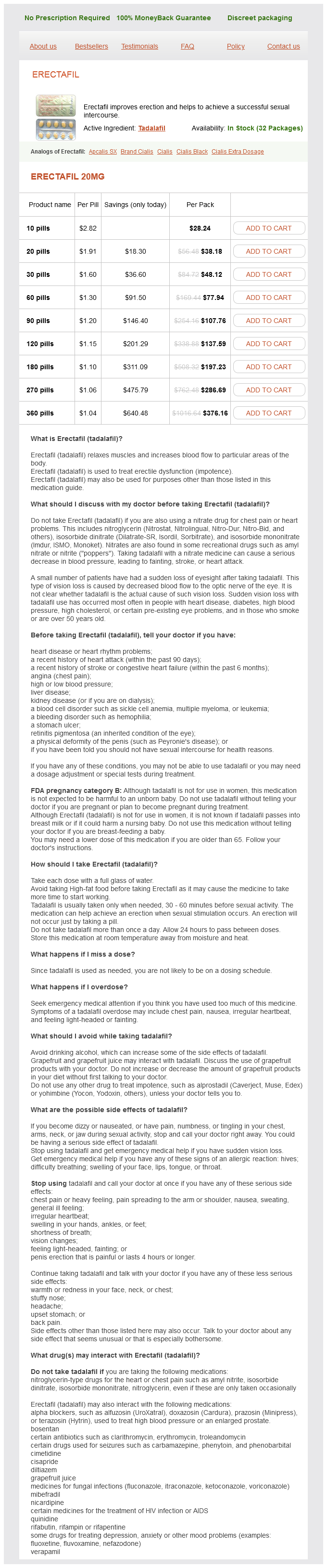 Erectafil packs: 10 pills, 20 pills, 30 pills, 60 pills, 90 pills, 120 pills, 180 pills, 270 pills, 360 pills