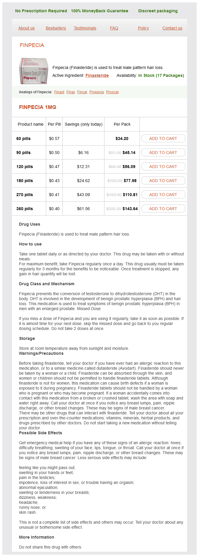 Finpecia packs: 60 pills, 90 pills, 120 pills, 180 pills, 270 pills, 360 pills