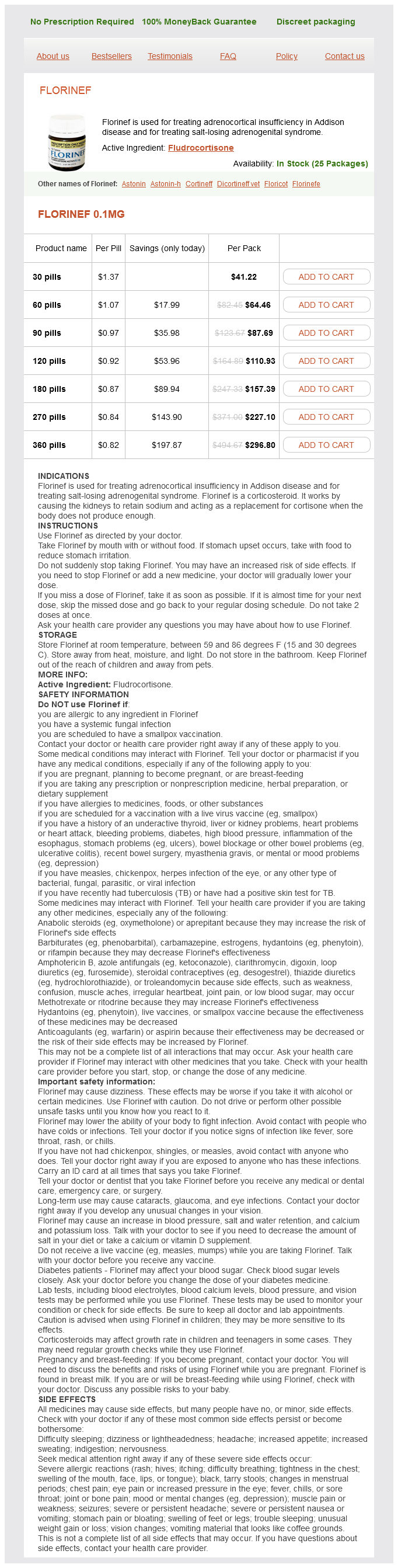 Florinef packs: 30 pills, 60 pills, 90 pills, 120 pills, 180 pills, 270 pills, 360 pills