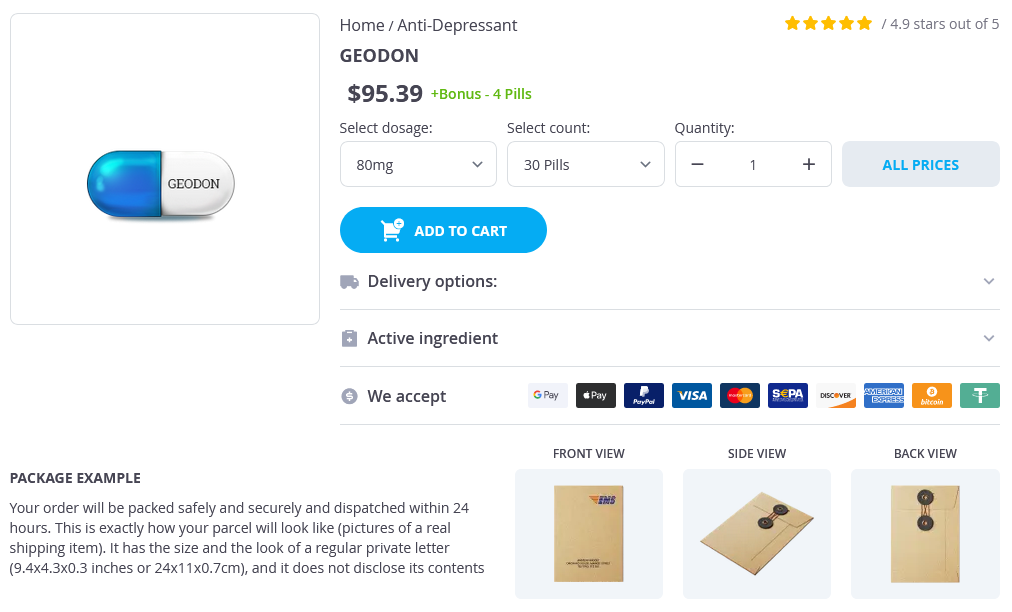 Geodon packs: 30 pills, 60 pills, 90 pills, 120 pills, 180 pills, 360 pills