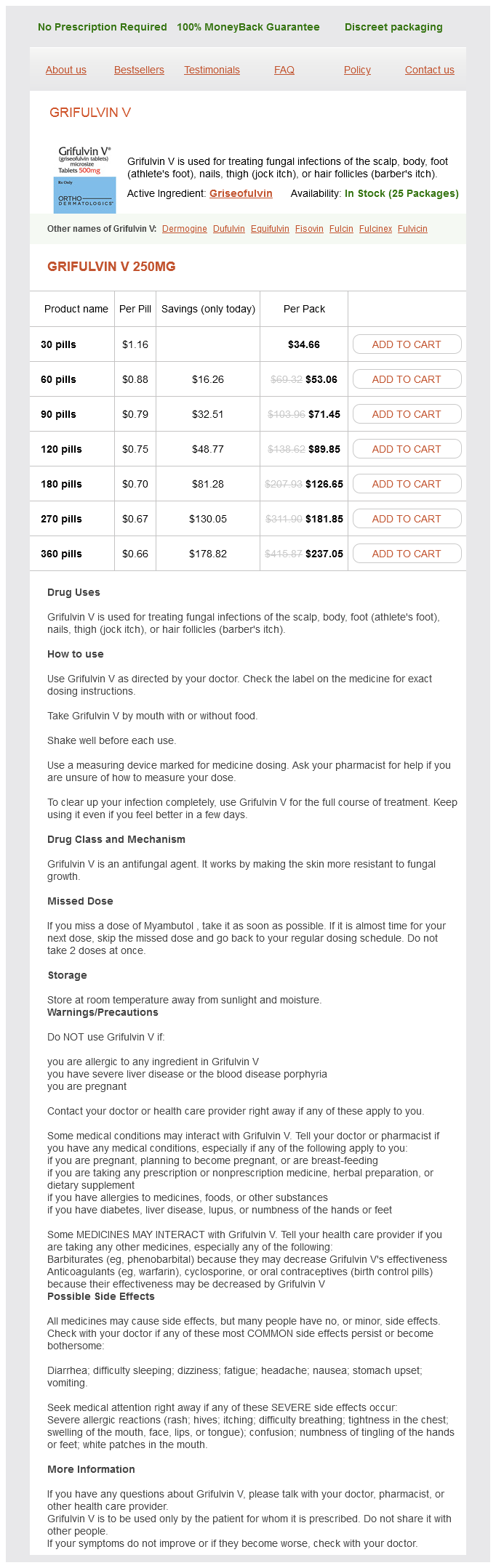 Grifulvin V packs: 30 pills, 60 pills, 90 pills, 120 pills, 180 pills, 270 pills, 360 pills