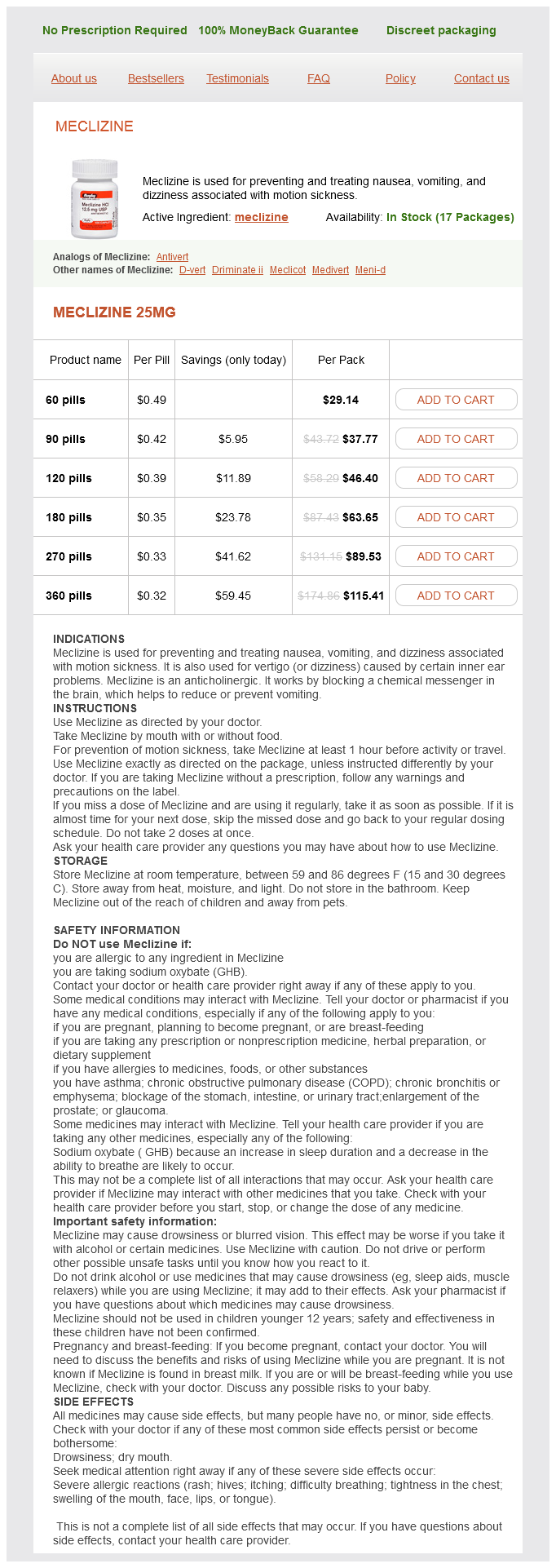 Tags: purchase meclizine 25 mg online, meclizine 25 mg buy lowest price, meclizine 25 mg order on line, generic meclizine 25 mg visa
