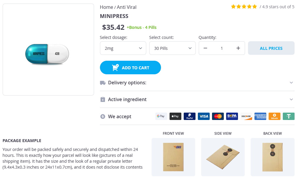 Minipress packs: 30 pills, 60 pills, 90 pills, 120 pills, 180 pills, 240 pills, 270 pills, 300 pills, 360 pills
