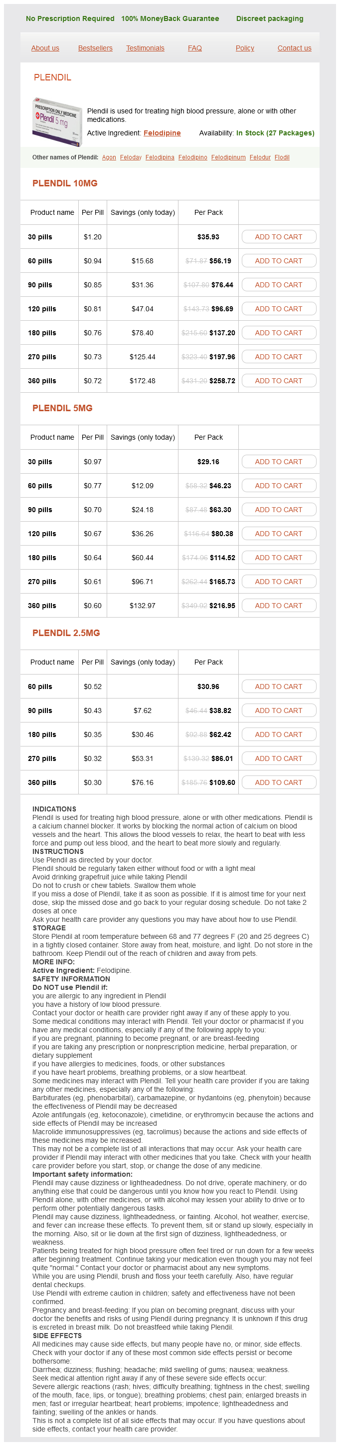 Plendil packs: 30 pills, 60 pills, 90 pills, 120 pills, 180 pills, 270 pills, 360 pills
