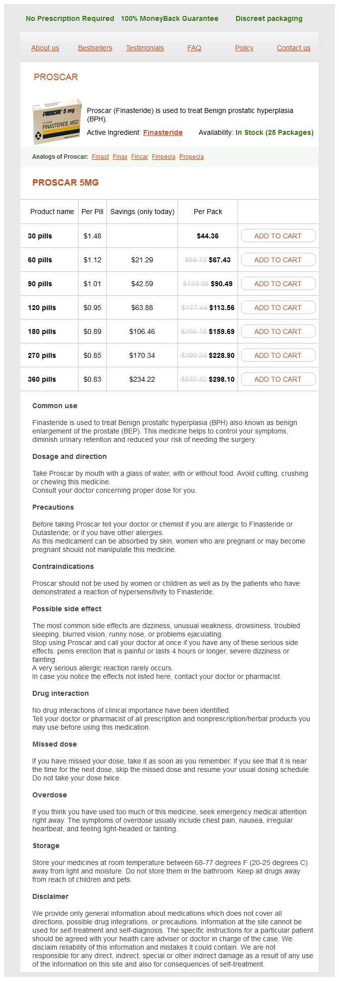 Proscar packs: 30 pills, 60 pills, 90 pills, 120 pills, 180 pills, 270 pills, 360 pills
