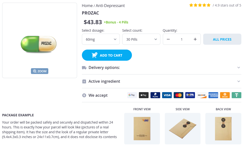 Prozac packs: 30 pills, 60 pills, 90 pills, 120 pills, 180 pills, 240 pills, 270 pills, 300 pills, 360 pills