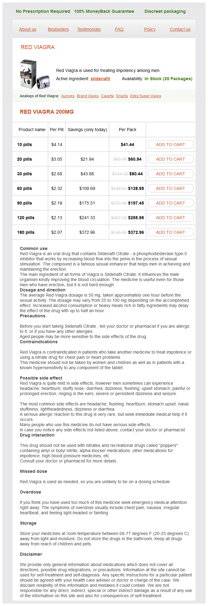 Red Viagra packs: 10 pills, 20 pills, 30 pills, 60 pills, 90 pills, 120 pills, 180 pills