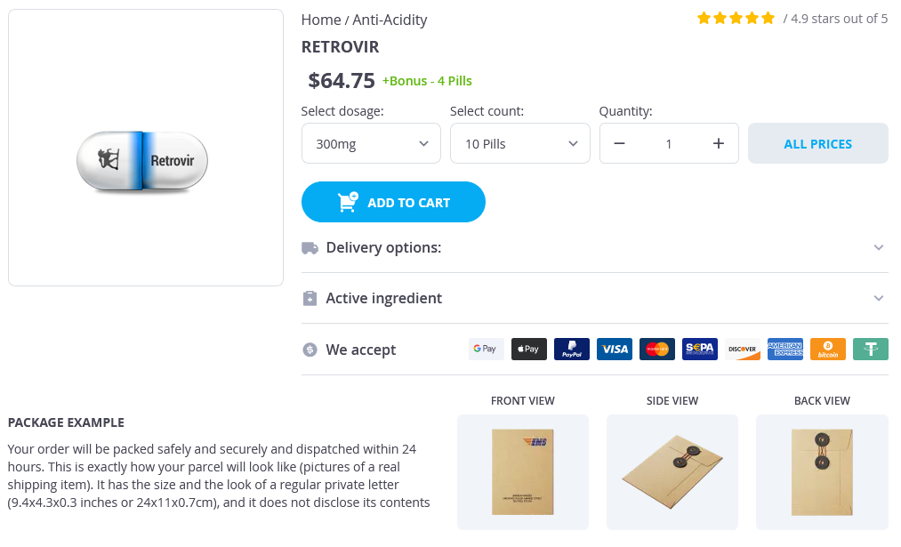 Retrovir packs: 10 pills, 20 pills, 30 pills, 60 pills, 90 pills, 120 pills, 180 pills, 270 pills, 360 pills