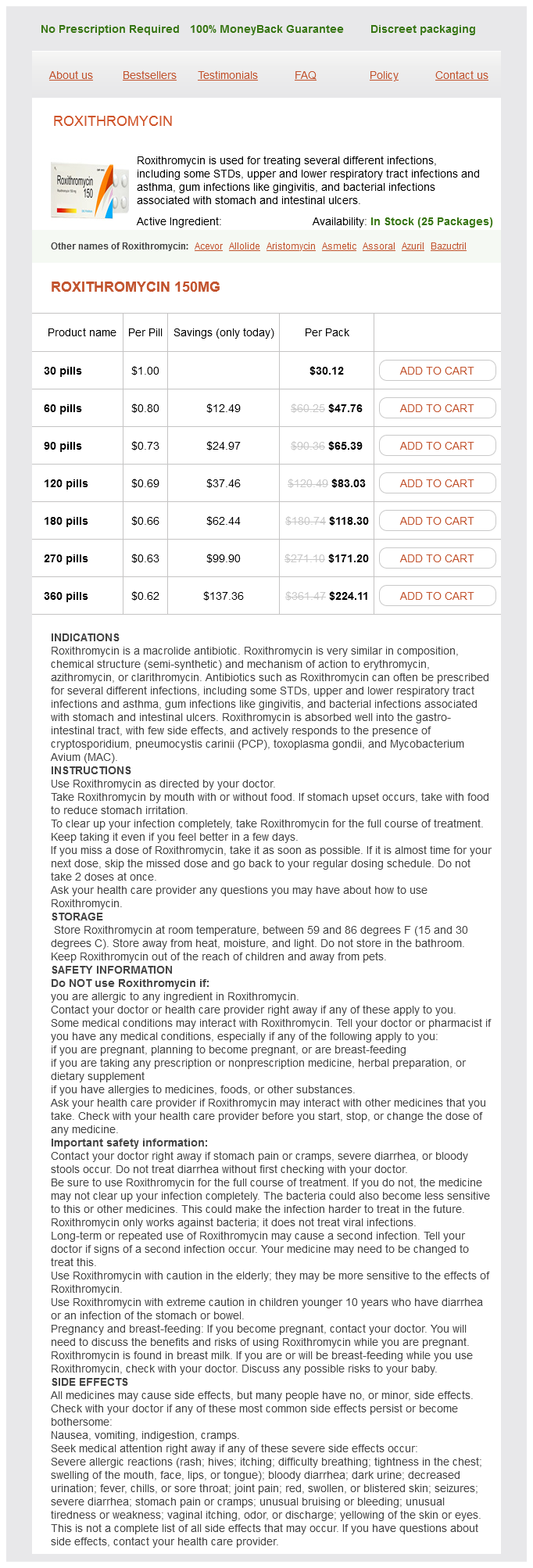 Prosthesis (plural virus - discount 150 mg roxithromycin with mastercard, prostheses)-A human-made product used to augment a damaged or to replace a missing body part. The plan may include fabrication of the prosthesis, as well as measuring and preparing the patient for the device, evaluating the prosthesis for safety and functionality after delivery, and instructing the patient in the proper care and maintenance of the device. Over time, an implant may break, may become uncomfortable, or may stop functioning. Any of these occurrences may require a replacement implant or additional surgery to rectify. Several weeks or months of drug therapy may be required before the full benefits are apparent. Common side effects include diarrhea, stomach discomfort, nausea, and mouth sores. Some of these drugs can have interactions with other medication, and indinavir can be associated with kidney stones. Reyatraz has been shown to have fewer side effects than some protease inhibitors, though it can interact with other medications, including certain heart medications and antidepressants. Experts do not know whether the drugs pass into breast milk, so breastfeeding mothers should avoid them or should stop nursing until the treatment is completed. This class of drugs includes indinavir (Crixivan), ritonavir (Norvir), nelfinavir (Viracept), amprenavir (Agenerase), lopinavir plus ritonavir (Kaletra), saquinavir (Fortovase), and atazanavir (Reyataz). Proteins are constituents of muscle, enzymes, hormones, transport proteins, hemoglobin, and other functional and structural elements of the body. Albumin and globulin make up most of the protein within the body and are measured in the total protein of the blood and other body fluids. Thus, the serum (blood) protein components test measures the total protein, as well as its albumin and globulin components in the blood. Albumin is made in the liver and constitutes approximately 60% of the total protein. The main function of albumin is to maintain osmotic pressure and to help transport certain blood constituents around the body via the bloodstream. Because albumin is made in the liver, it is one element that is used to monitor liver function. Globulin is the basis for antibodies, glycoproteins (protein-carbohydrate compounds), lipoproteins (proteins involved in fat transport), and clotting factors. Globulins are divided into three main groups, the alpha, beta, and gamma globulins.