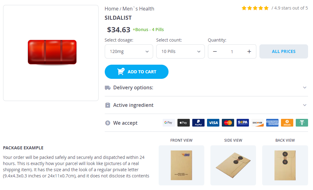 Sildalist packs: 10 pills, 20 pills, 30 pills, 60 pills, 90 pills, 120 pills, 180 pills, 270 pills, 360 pills