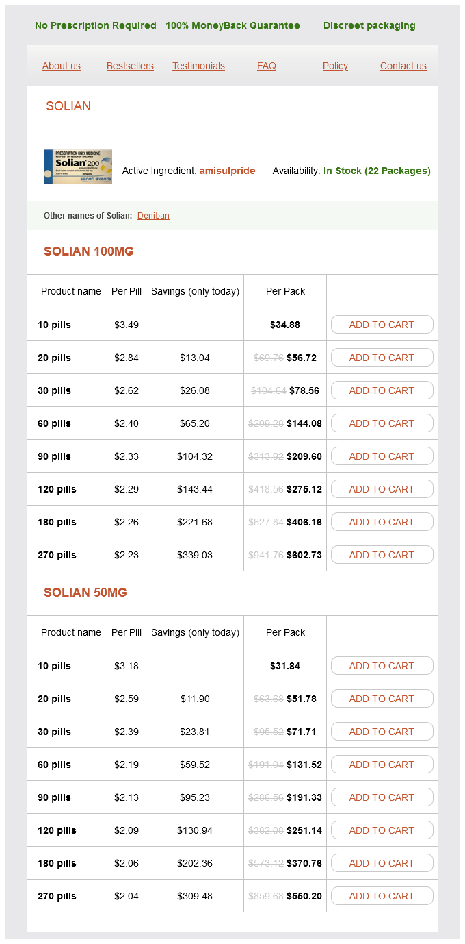 Solian packs: 10 pills, 20 pills, 30 pills, 60 pills, 90 pills, 120 pills, 180 pills, 270 pills