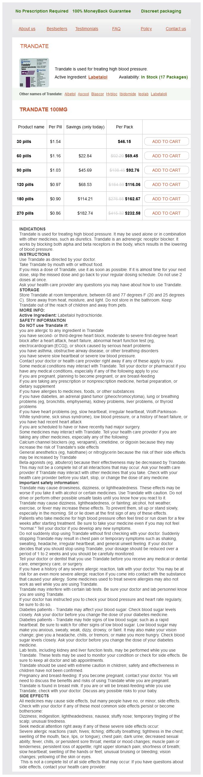 Trandate packs: 30 pills, 60 pills, 90 pills, 120 pills, 180 pills, 270 pills