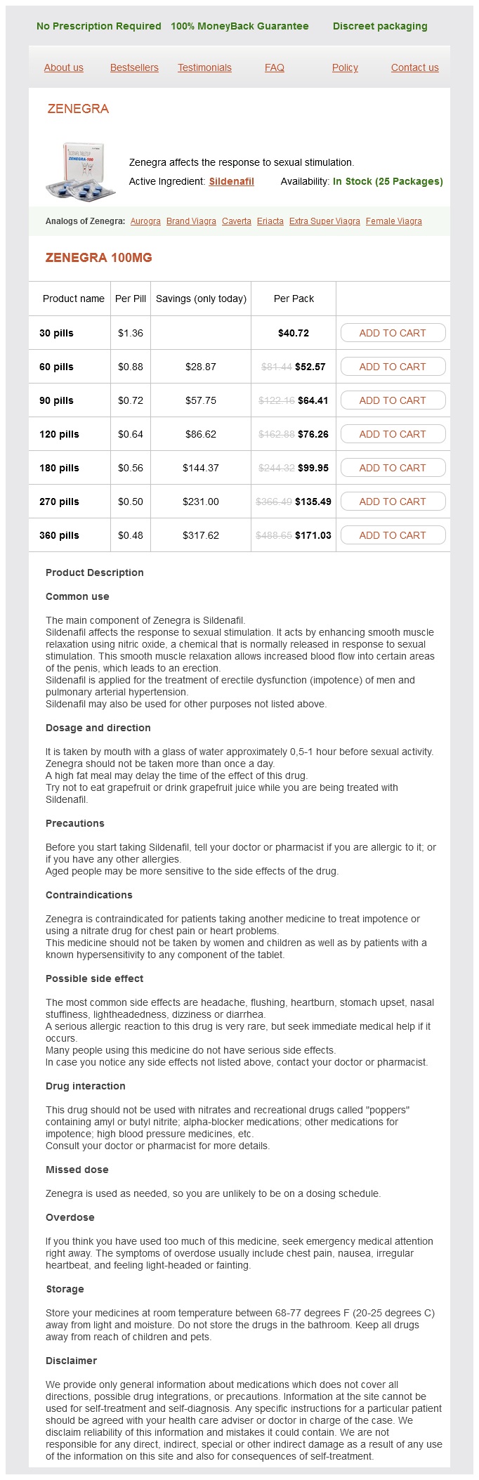 Zenegra packs: 30 pills, 60 pills, 90 pills, 120 pills, 180 pills, 270 pills, 360 pills
