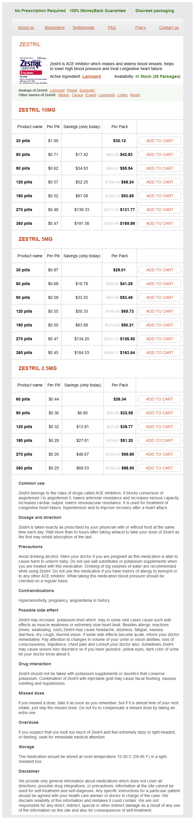 Zestril dosages: 10 mg, 5 mg, 2.5 mg
