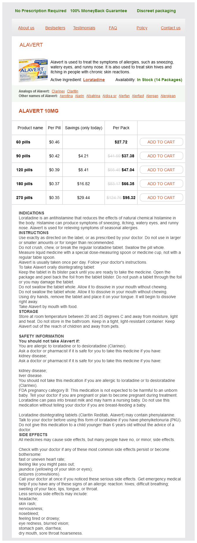 Proteomic profiling of serologic response to Candida albicans during host-commensal and host-pathogen interactions allergy treatment with acupuncture alavert 10 mg order with visa. Sakolvaree Y, Maneewatch S, Jiemsup S, Klaysing B, Tongtawe P, Srimanote P, et al. Identification of a serodiagnostic antigen, legumain, by immunoproteomic analysis of excretory-secretory products of Clonorchis sinensis adult worms. Recent advancements in surface-enhanced laser desorption/ ionization-time of flight-mass spectrometry. Proteomic analyses of monocyte derived macrophages infected with human immunodeficiency virus type 1 primary isolates from Hispanic women with and without cognitive impairment. Prediction of liver fibrosis and cirrhosis in chronic hepatitis B infection by serum proteomic fingerprinting: a pilot study. Patients with chronic hepatitis C achieving a sustained virological response to peginterferon and ribavirin therapy recover from impaired hepcidin secretion. Serum proteomic fingerprints of adult patients with severe acute respiratory syndrome. Trypanosome apoptotic factor mediates apoptosis in human brain vascular endothelial cells. A serum protein signature with high diagnostic value in bacterial endocarditis: results from a study based on surface-enhanced laser desorption/ionization time-of-flight mass spectrometry. Proteomic identification of biomarkers related to Helicobacter pylori-associated gastroduodenal disease: challenges and opportunities. Luplertlop N, Surasombatpattana P, Patramool S, Dumas E, Wasinpiyamongkol L, Saune L, et al. Induction of a peptide with activity against a broad spectrum of pathogens in the Aedes aegypti salivary gland, following infection with Dengue virus. Plants defensins: novel antimicrobial peptides as components of the host defense system. Crosstalk between plant responses to pathogens and herbivores: a view from the outside in. Root-knot nematode parasitism an host response: molecular basis of a sophisticated interaction. Trichinella spiralis infected skeletal muscle cells arrest in G2/M and cease muscle gene expression. Proteome of Aedes aegypti larvae in response to infection by the intracellular parasite Vavraia culicis. Invasion of the body e snatchers: the diversity and evolution of manipulative strategies in hosteparasite interactions. Proteomics in vaccinology and immunobiology: an informatics perspective of the immunone. Integrating genomics, proteomics and bioinformatics in translational studies of molecular medicine.