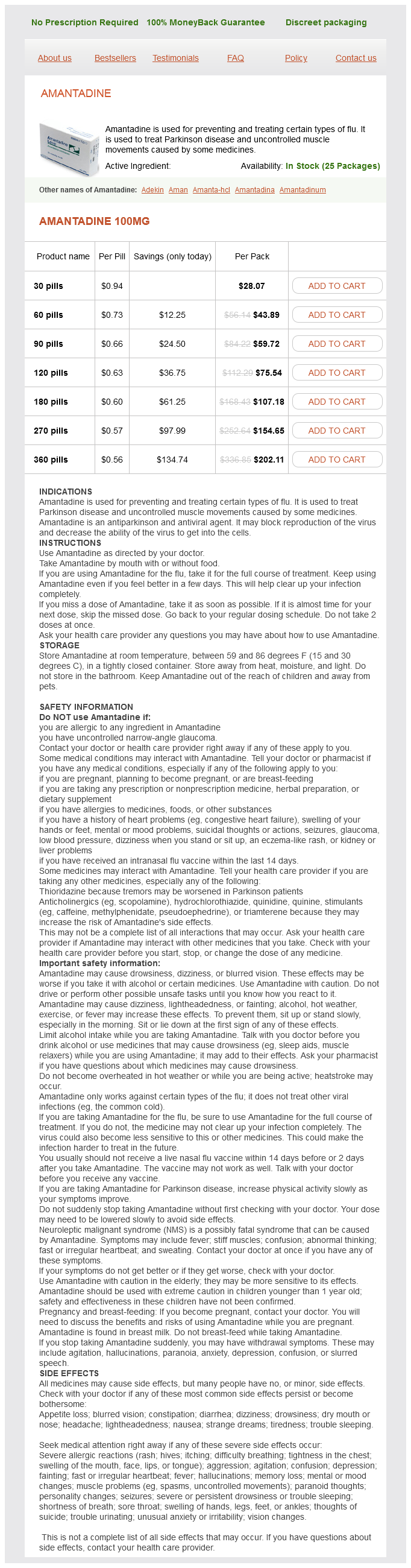 Amantadine packs: 30 pills, 60 pills, 90 pills, 120 pills, 180 pills, 270 pills, 360 pills