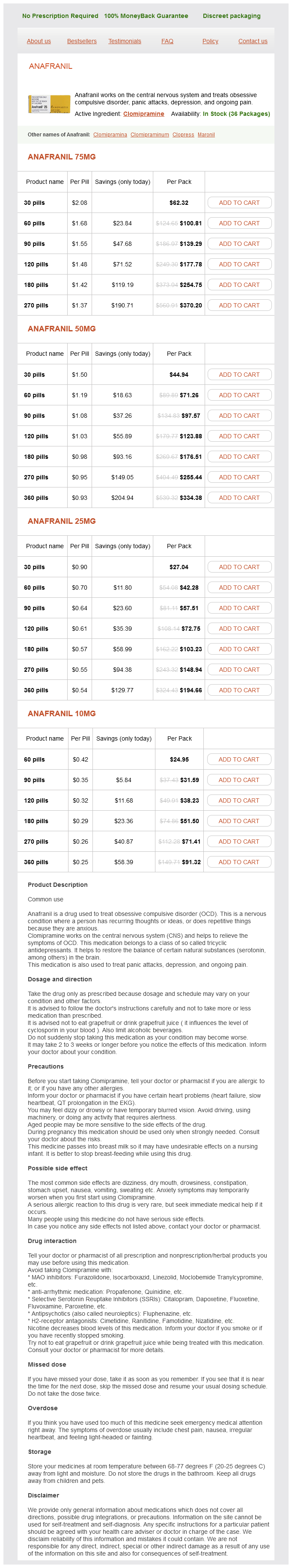 Anafranil packs: 30 pills, 60 pills, 90 pills, 120 pills, 180 pills, 270 pills, 360 pills