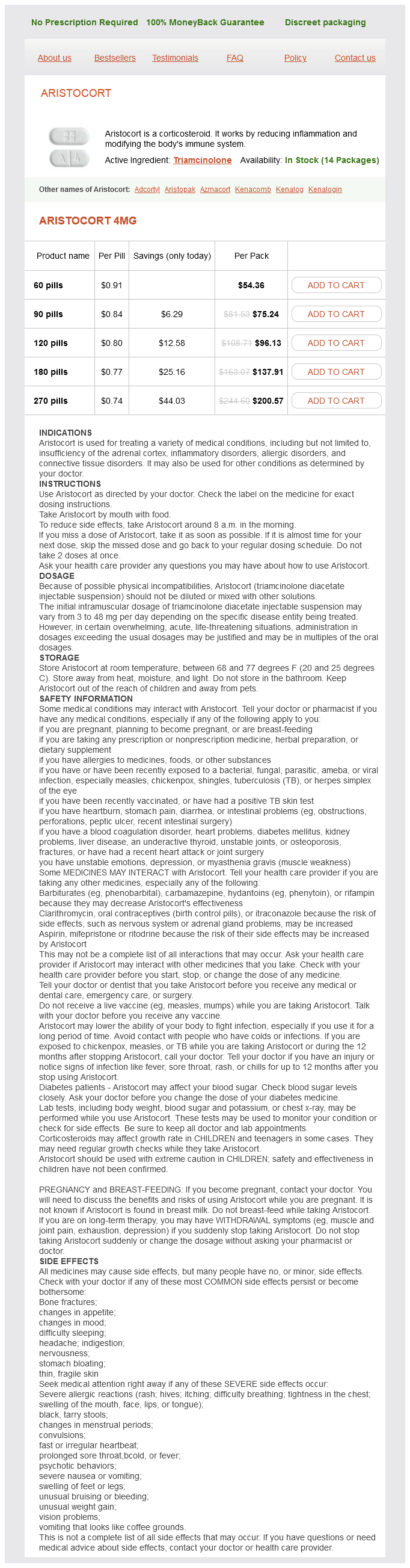 Aristocort packs: 60 pills, 90 pills, 120 pills, 180 pills, 270 pills