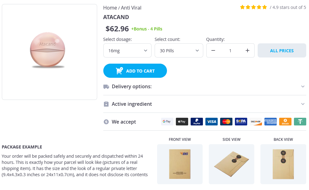Atacand packs: 30 pills, 60 pills, 90 pills