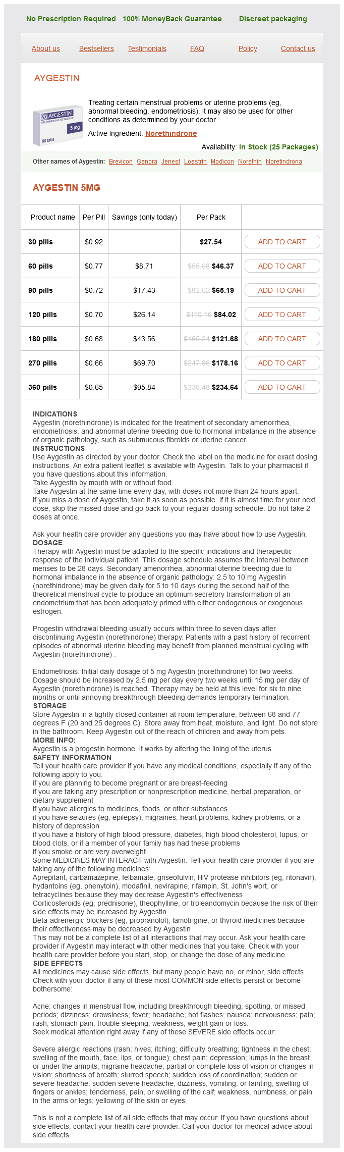 Aygestin packs: 30 pills, 60 pills, 90 pills, 120 pills, 180 pills, 270 pills, 360 pills