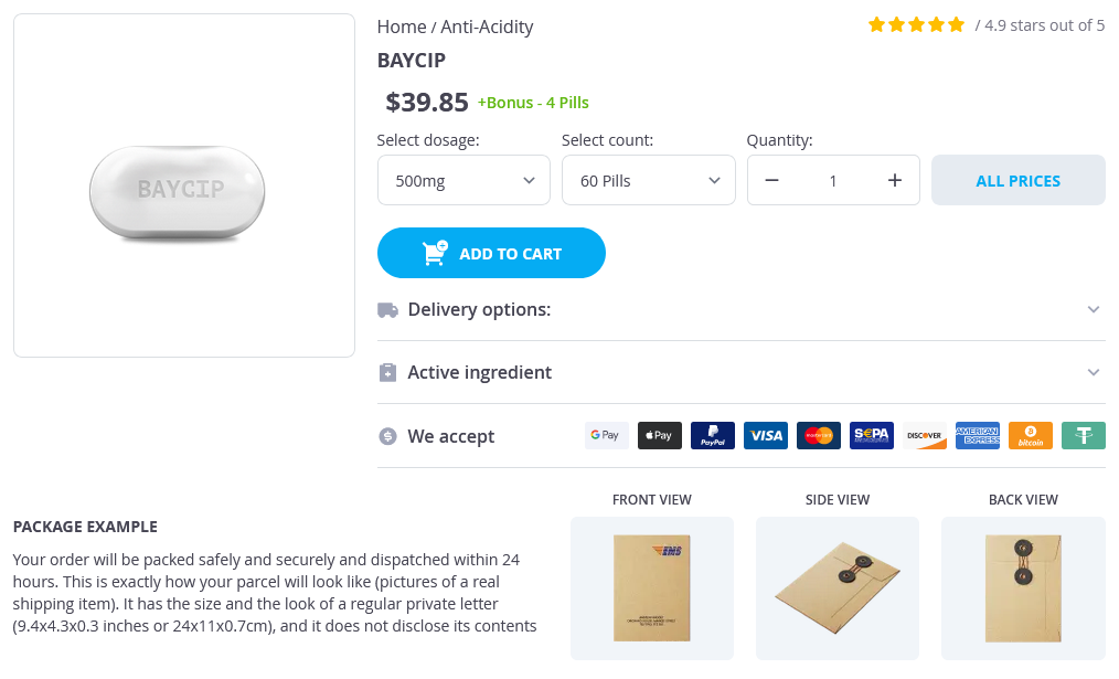 Baycip packs: 60 pills, 90 pills, 120 pills, 180 pills, 270 pills, 360 pills