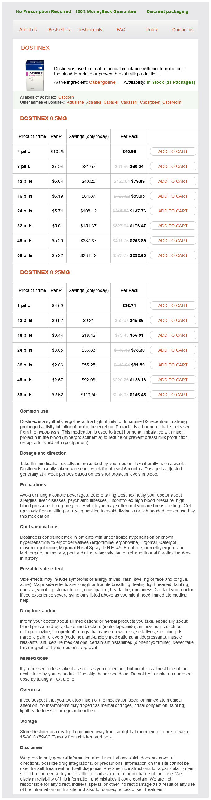 Cabergoline dosages: 0.25 mg, 0.5 mg