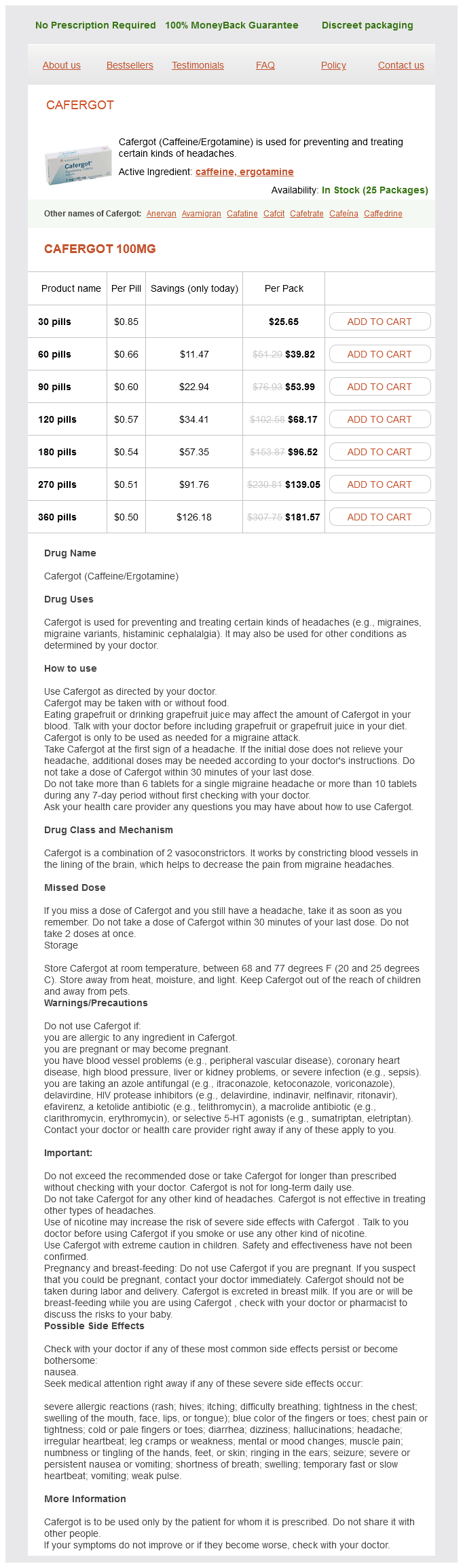 Cafergot packs: 30 pills, 60 pills, 90 pills, 120 pills, 180 pills, 270 pills, 360 pills