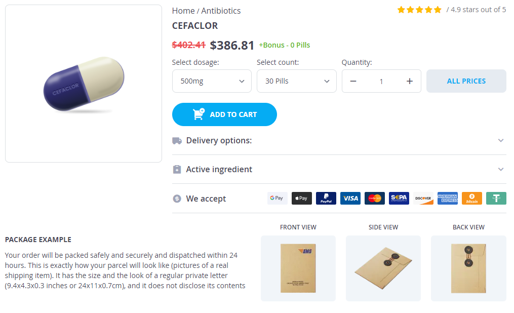 Cefaclor packs: 10 pills, 20 pills, 30 pills, 40 pills, 50 pills