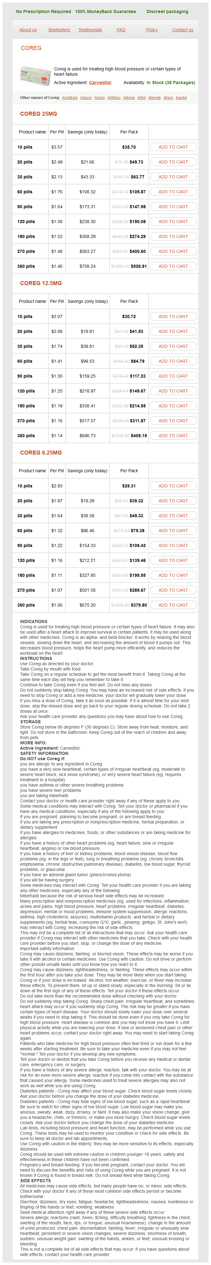 Coreg packs: 10 pills, 20 pills, 30 pills, 60 pills, 90 pills, 120 pills, 180 pills, 270 pills, 360 pills
