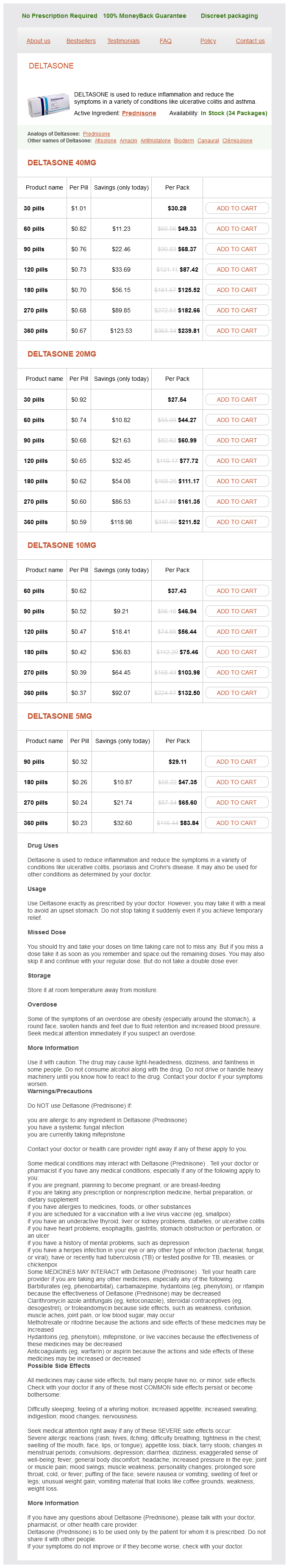 Deltasone packs: 30 pills, 60 pills, 90 pills, 120 pills, 180 pills, 270 pills, 360 pills