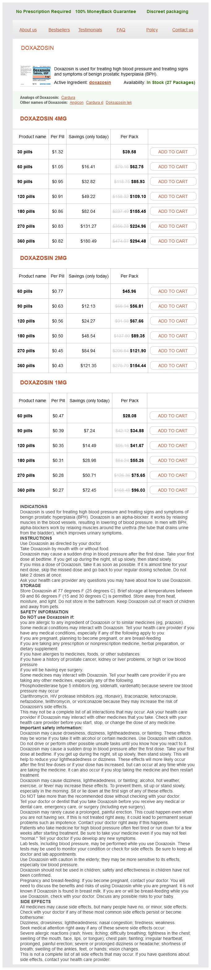 Doxazosin packs: 30 pills, 60 pills, 90 pills, 120 pills, 180 pills, 270 pills, 360 pills