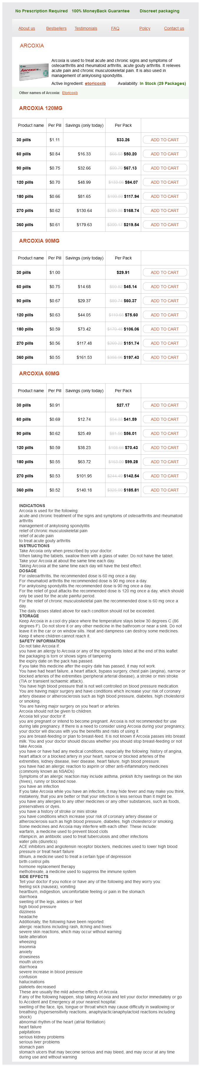 Etoricoxib packs: 30 pills, 60 pills, 90 pills, 120 pills, 180 pills, 270 pills, 360 pills