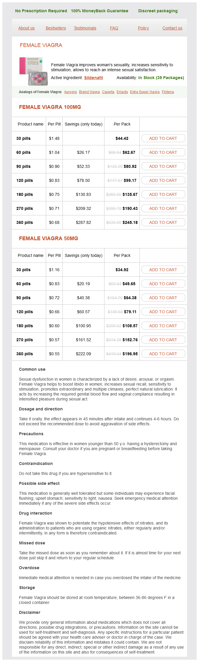 Female Viagra packs: 30 pills, 60 pills, 90 pills, 120 pills, 180 pills, 270 pills, 360 pills
