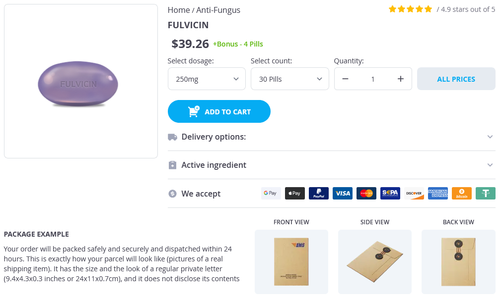 Griseofulvin packs: 30 pills, 60 pills, 90 pills, 120 pills, 180 pills, 270 pills, 360 pills