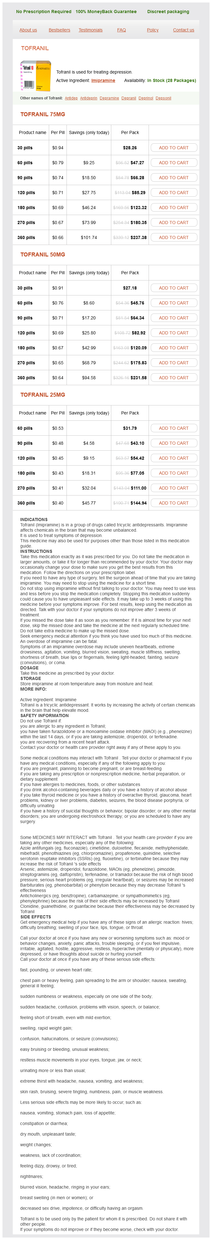 Imipramine packs: 30 pills, 60 pills, 90 pills, 120 pills, 180 pills, 270 pills, 360 pills