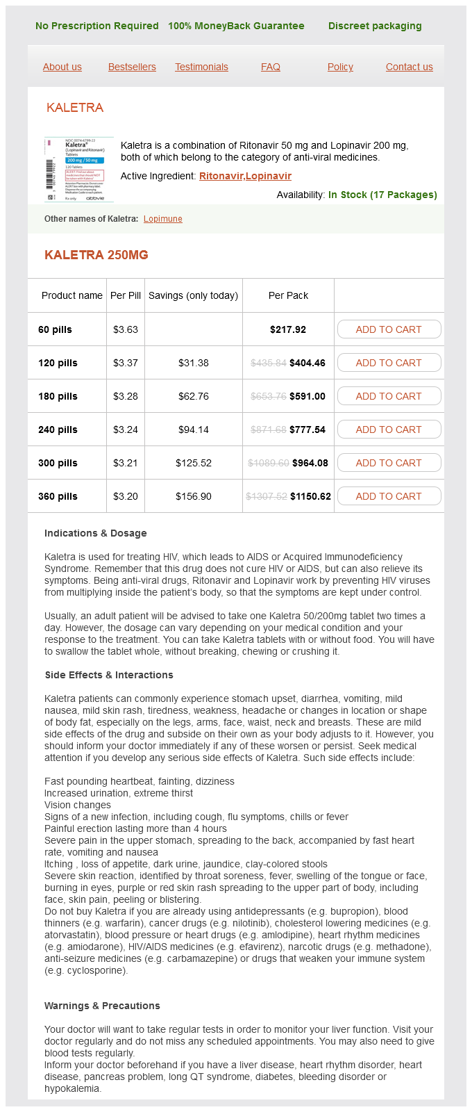 Kaletra packs: 60 pills, 120 pills, 180 pills, 240 pills, 300 pills, 360 pills