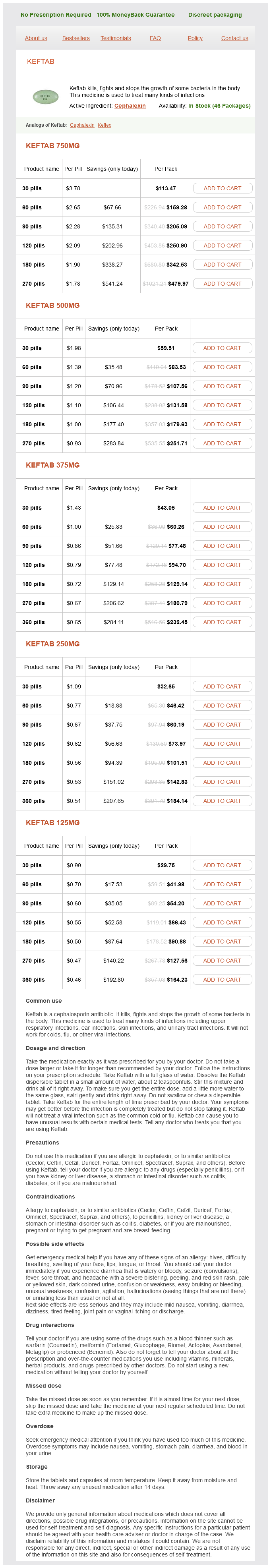 Keftab packs: 30 pills, 60 pills, 90 pills, 120 pills, 180 pills, 270 pills, 360 pills
