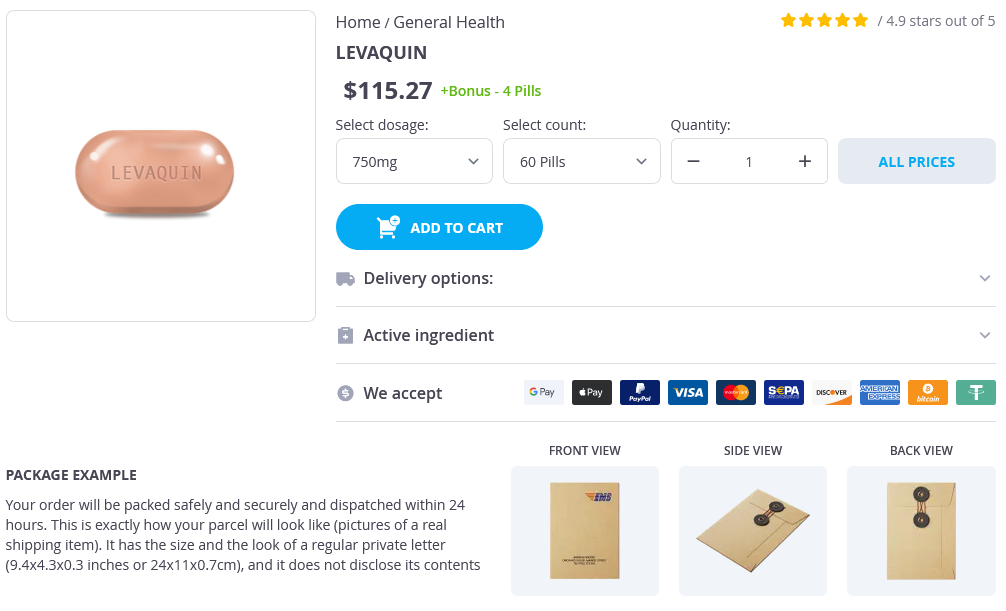 Levaquin packs: 60 pills, 90 pills, 120 pills, 180 pills, 360 pills