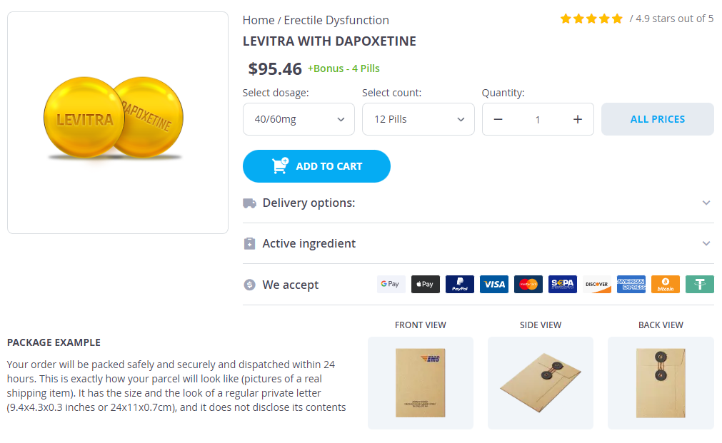 Levitra with Dapoxetine packs: 12 pills, 20 pills, 30 pills, 32 pills, 60 pills, 90 pills, 120 pills, 180 pills, 240 pills, 300 pills
