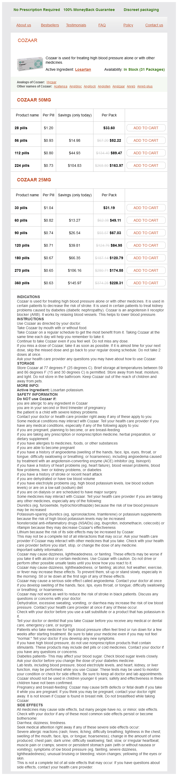 Losartan packs: 28 pills, 56 pills, 112 pills, 224 pills, 30 pills, 60 pills, 90 pills, 120 pills, 180 pills, 270 pills, 360 pills