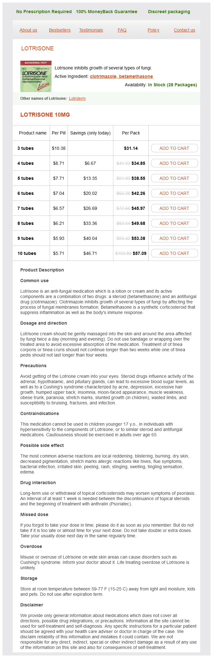 The factors responsible for familial or heritable prostate cancer can be either single nucleotide polymorphisms identified through genome-wide association studies which are usually associated with modest increased risk of prostate cancer or some rare mutants that can substantially increase the risk [98 antifungal tinea versicolor 10 mg lotrisone order with visa, 184-186]. The genome wide association studies indicated chromosomal loci such as 8q24, 17p with familial risk of prostate cancer [98, 184-186]. These mutations therefore are responsible for cancer-associated mortality [98, 185, 187]. However, elaborate studies in this area should be performed to link the genetic testing with the identification of familial prostate cancer predisposition and design specific treatment strategies to treat this high-risk prostate cancer patient. This mutation is specifically found in young prostate cancer patient with a family history [192-194]. They are particularly relevant for Molecular Mediator of Prostate Cancer Progression and Its Implication. Simultaneous activation of these signaling pathways promotes tumor progression and castration resistance in prostate cancer cell lines and mouse models, while combinatorial inhibition of these pathways inhibits castration resistant prostate cancer in genetically engineered mice [203, 204, 208]. Oncogenic Tyrosine Kinases the deregulated expression of oncogenic tyrosine kinases has been studied extensively in many cancers, since these can represent targets for therapeutic intervention [213]. Summary Insights gained through cutting edge research is important to classify the molecular subtypes of prostate cancer. It will thus help to identify candidate driver mutations specific to a certain stage of prostate cancer and thus help to develop better treatment strategy. It is crucial to identify the high risk prostate cancer patients early, which will help to start aggressive treatment of those patients with curative intent. At the same time, patients with indolent disease can be spared from morbidity due to unnecessary invasive treatments. Prostate specific membrane antigen expression in prostatic intraepithelial neoplasia and adenocarcinoma:astudyof184cases. The molecularandcellular sequelae of experimental traumatic brain injury: pathogenetic mechanisms. Epithelial cell differentiation in thehuman prostate epithelium: implications for the pathogenesis and therapy of prostate cancer. Dissectingcell-typespecific roles of androgen receptor in prostate homeostasis and regeneration throughlineagetracing. The role of androgens and stroma in architectural organisation and the maintenance of differentiated secretory function. Prostate adenocarcinomas aberrantly expressing p63 are molecularly distinctfromusual-typeprostaticadenocarcinomas. Prostate epithelial cell of origin determines cancer differentiation state in an organoid transformationassay. Divergent clonal evolution of castration-resistant neuroendocrine prostate cancer. Selectingtreatment for high-risk, localized prostate cancer: thecase forradicalprostatectomy.